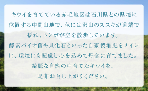 キウイを育てている赤毛地区は石川県との県境に位置する中間山地で、秋になると沢山のススキが道端で揺れ、トンボが空を散歩しています。