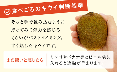 そっと手で包み込むように持ってみて弾力を感じるくらいが、ベストタイミング。甘く熟したキウイです。 まだ硬いと感じたら、リンゴやバナナ等とビニル袋に入れると追熟が早まります。
