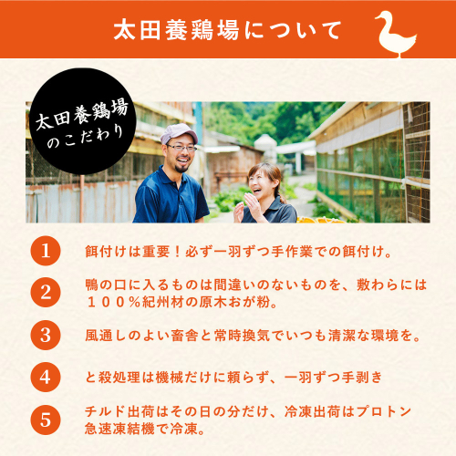 紀州鴨は温暖で一年を通して気温の変化の少ない和歌山県有田郡で飼育されています。 ストレスのない環境で10羽/坪以下の低密度飼育をしています。 風通しの良い畜舎で一年中浜風を受け、山から流れてくる谷水を飲み、 独自配合のペレット飼料を食べ、紀州材100%のおが粉の敷料の上で育った鴨は、 真っ白い油と鮮やかな赤みの肉のコントラストが美しい外観を持ち、鴨肉独特の臭みが少ない、 しかしながら濃厚な脂のコクがある最高級の紀州鴨になります。