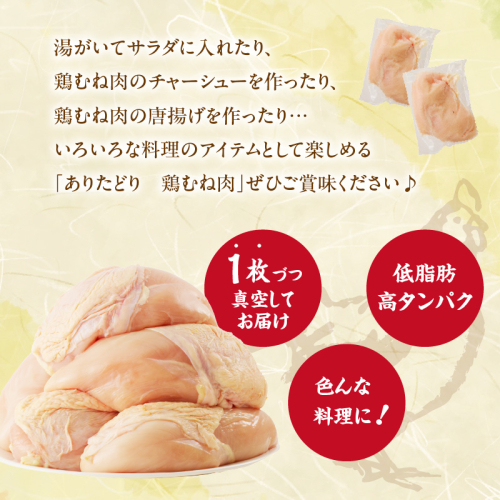 今回、低脂肪、高タンパク質な「ありたどり 鶏むね肉」約2kgを1枚ずつ真空された状態でお届けします。