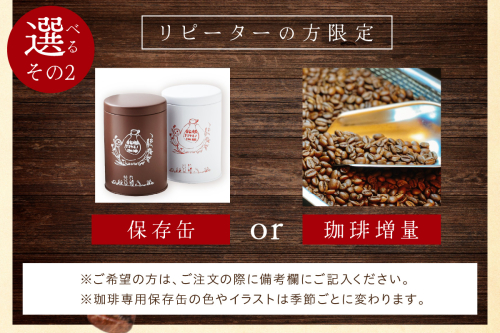 ・リピーターの方で保存缶が不要の方は、備考欄にご記入ください。保存缶が不要の方につきましては、コーヒー豆(もしくは粉)を増量いたします。