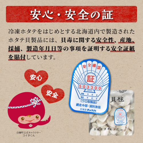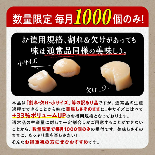 大きいホタテでわけありとは思えないしっかりとしたホタテです。1キロでとってもお得!来年度もリピしたいです