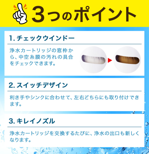 MONOシリーズ 使いやすいデザインモデル 【ここがポイント!】 1:チェックウインドー 浄水カートリッジの窓枠から、中空糸膜の汚れの具合をチェックできます。 2:スイッチデザイン 利き手やシンクに合わせて、左右どちらにも取り付けできます。 3:キレイノズル 浄水カートリッジを交換するたびに、浄水の出口も新しくなります。 ■返礼品提供事業者 三菱ケミカル・クリンスイ株式会社