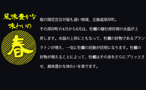 厚岸の四季を通して育った牡蠣は、春夏秋冬で身質が違い、旨みはそれぞれの良さがあります。