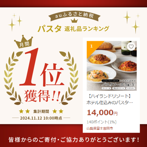 ホテルハイランドリゾートシェフ特製のパスタソースが3種のセットになっております。
