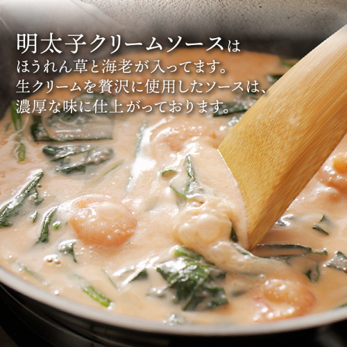 「明太子クリームソース」はほうれん草と海老が入ってます。