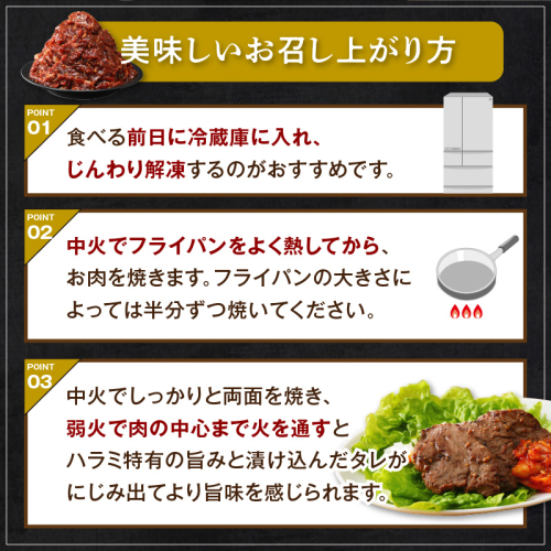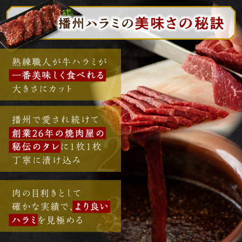 熟練職人が牛ハラミが一番美味しく食べれる大きさにカットし、播州で愛され続けて創業26年の焼肉屋の秘伝のタレに1枚1枚丁寧に漬け込んでいます。
