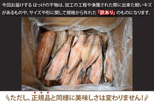 今回お届けする ほっけの干物は、加工の工程や漁獲された際に出来た軽いキズがあるものや、サイズや形に関して規格から外れた「訳あり」のものになります。