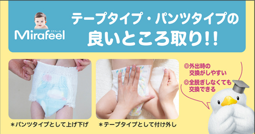 ミラフィールは、パンツ型のはかせやすさと、テープ型の調整しやすさを兼ね備えた「ハイブリッド型紙おむつ」。